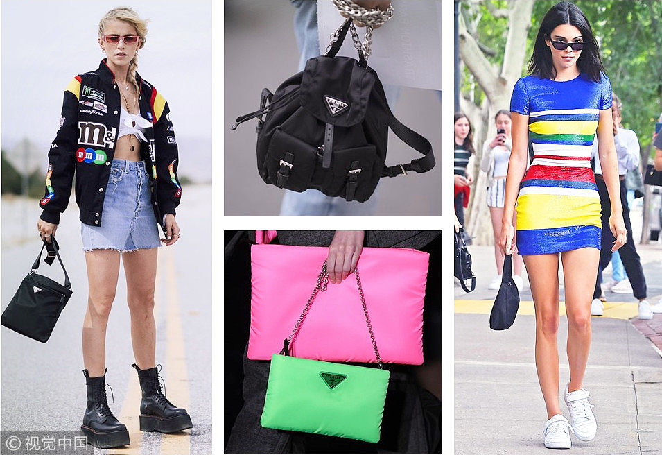 ????小編發(fā)現(xiàn)自打今年年初開(kāi)始,歐美潮流圈的各路時(shí)髦精們一時(shí)間都開(kāi)始團(tuán)寵Prada的尼龍包,土酷古板的外形和中性的面料,怎么看都跟時(shí)髦不沾邊,但是就是這么莫名其妙的迎來(lái)了自己的“第二春”!經(jīng)典的Prada尼龍包的設(shè)計(jì),其實(shí)非常簡(jiǎn)單實(shí)用,明顯的Prada三角Logo,搭配看起來(lái)超級(jí)商務(wù)的全黑和正經(jīng)的拉鏈設(shè)計(jì),可以說(shuō)是非常的中規(guī)中矩了,但是就是這樣規(guī)規(guī)矩矩的設(shè)計(jì),卻意外和現(xiàn)在正火的街頭風(fēng)和復(fù)古風(fēng)特別搭調(diào),火遍大街小巷~ (圖片來(lái)源:視覺(jué)中國(guó))