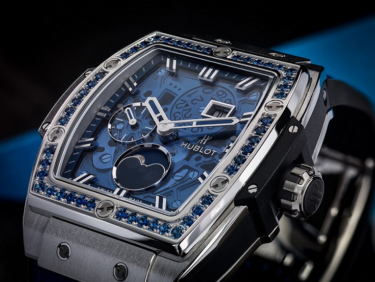 Big Bang靈魂系列月相鈦金藍色與王金紫色腕表,表圈分別鑲嵌48顆藍色藍寶石和紫水晶,搭載藍色和紫色短吻鱷魚皮內襯黑色橡膠表帶,整體均被賦予同色系,一氣呵成,營造時尚與質感的和諧統(tǒng)一,成就大氣而簡約的都市格調。Big Bang靈魂系列月相鈦金白色鑲鉆與王金款,一白一黑,宛如月明與月影的使者,記錄月輪的氤氳光影。(吳艷)