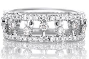 De Beers戴比爾斯Dewdrop鉆石戒指 –112顆鉆石宛若清爽的晨露,輕輕浮動(dòng)在兩個(gè)密鑲18K白金戒環(huán)之間。總重:0.95克拉。