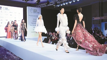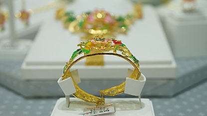 他的第二組造型則主打純粹的搖滾晚裝,尤其是個性十足的尖角翻領(lǐng)晚裝夾克。中國風(fēng)提花夾克背面繡有飛鳥,裝飾著水晶和亮片紋路。夾克上裝點著粉色和青綠色的云朵,綢緞尖角翻領(lǐng)處則點綴著手工縫制的水晶和亮片。不同配色的褲裝兩側(cè)均飾有亮片條紋。其余晚裝夾克也呈現(xiàn)了多元的印花與圖案,包括全身花卉刺繡、幾何圖案等,水晶和天鵝絨飾邊則更顯奢華。