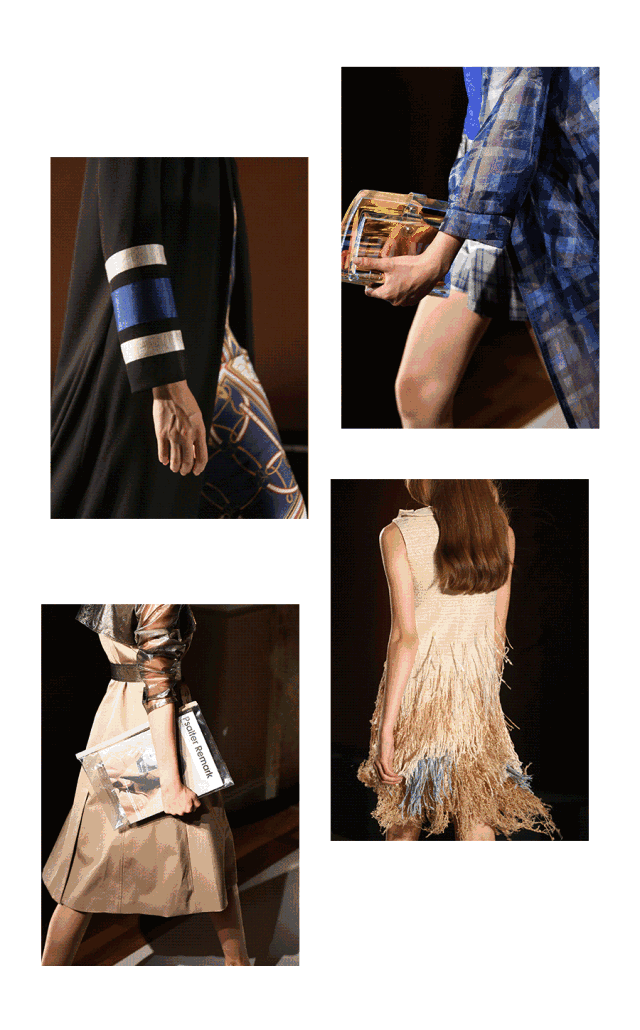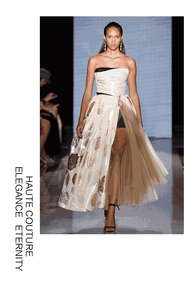 2019春夏系列全部運用立體剪裁,圍繞著人體線條在空間上互相轉(zhuǎn)換,以優(yōu)雅的線條打造不失女性力量、氣場十足的造型;并且在面料選擇上也別具匠心:金屬絲面料,帶有水光、電光般的光澤,象征著記憶的輪廓,呈現(xiàn)走秀主題“時光”的線條和概念。