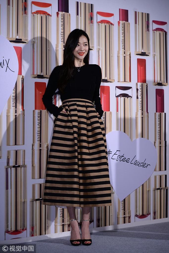 2017年4月5日訊,韓國首爾,5日,雪莉出席某美妝品牌活動。身穿黑色修身緊身針織衫,下穿棕色黑色橫條紋蓬蓬裙,腳穿麂皮金色一字帶魚嘴細(xì)跟高跟鞋。