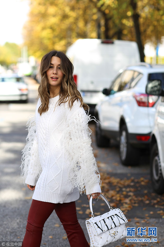 時(shí)尚博主Janina Pfau街拍。毛袖毛衣,手袋,發(fā)型:長(zhǎng)發(fā),卷發(fā),中分,棕發(fā),挑染,上衣:毛衣,白色,毛毛,鴕鳥毛,毛袖,長(zhǎng)袖,配飾:手袋,手拎包,白色,字母,logo,印花,鉚釘包,白色。(圖片來(lái)源:視覺(jué)中國(guó))