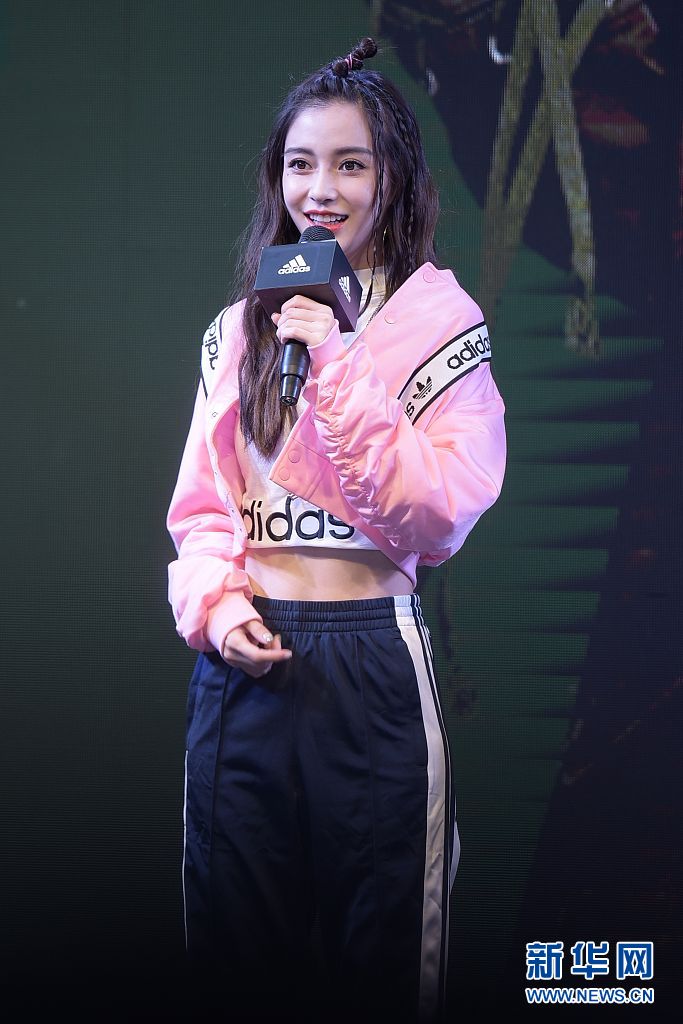 Angelababy粉色夾克+運動褲 梳蘋果頭嬌俏