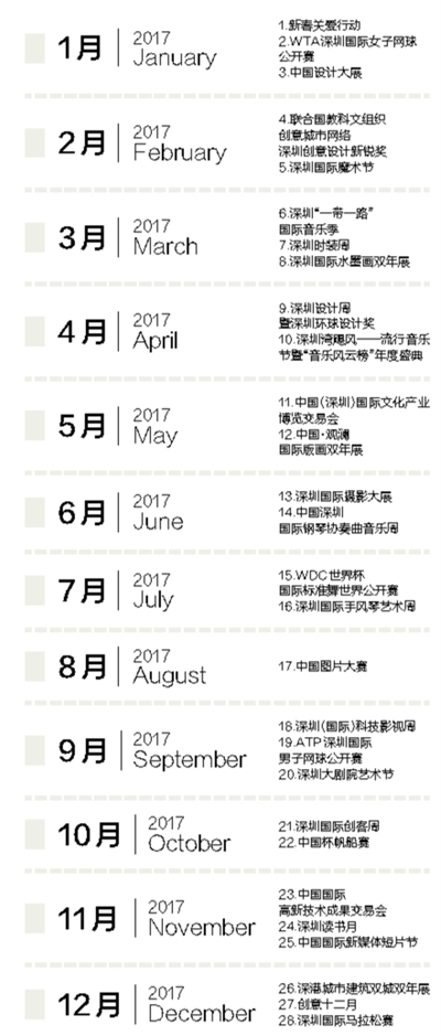 往細(xì)里說,“城市文化菜單”呈現(xiàn)出鮮明亮點(diǎn):一是國際化程度高。大部分活動都有國際權(quán)威和國家級專業(yè)機(jī)構(gòu)主辦或授權(quán)支持,不少活動代表了我國這一領(lǐng)域的最高水準(zhǔn),是可以代表深圳國際化城市形象的“文化大餐”。二是內(nèi)容豐富多彩。這份“菜單”表面上看只有28項(xiàng),實(shí)際上每項(xiàng)活動時間跨度從幾天到一個多月不等,由十?dāng)?shù)項(xiàng)甚至上百項(xiàng)活動組成,各款“菜式”都有,不同口味的人都可以自行“看單點(diǎn)菜”。三是體現(xiàn)深圳特色?!安藛巍敝杏腥种坏幕顒优c創(chuàng)新創(chuàng)意有關(guān),正好體現(xiàn)了深圳“創(chuàng)新之城”、“設(shè)計之都”的城市特性,可謂是深圳的文化“特產(chǎn)”。四是新的品牌活動首次集體亮相。經(jīng)過多年培育,深圳已經(jīng)擁有文博會、高交會、讀書月、創(chuàng)意12月等傳統(tǒng)品牌活動,接下來還要精心打造一系列新的文化品牌活動。在這份“菜單”中,2016年及今年新創(chuàng)辦的就有深圳“一帶一路”國際音樂季、深圳國際科技影視周、深圳國際攝影大展、深圳設(shè)計周、中國圖片大賽等多項(xiàng)活動,文博會、新春關(guān)愛行動、國際魔術(shù)節(jié)等老牌活動也都將有新的策劃、新的提升,更具國際化內(nèi)涵。一句話,這份菜單共匯集了國際化、標(biāo)志性的品牌文化活動28項(xiàng),涵蓋文化藝術(shù)、創(chuàng)意設(shè)計、科技創(chuàng)新、體育休閑等多個類別,是廣義的文化活動的概念。