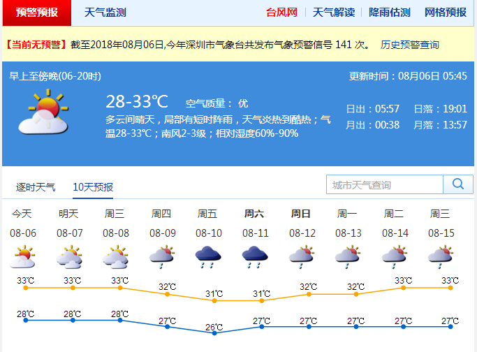 多云仍是今日深圳天氣的主格調(diào),部分時(shí)間陽光猛烈,局部還會出現(xiàn)短時(shí)陣雨或雷陣雨。氣溫較高,最低氣溫在28℃左右,最高氣溫升至33℃左右,北部及人口密集區(qū)的氣溫將達(dá)34-35℃。外出應(yīng)注意防曬,中午前后應(yīng)減少戶外活動。