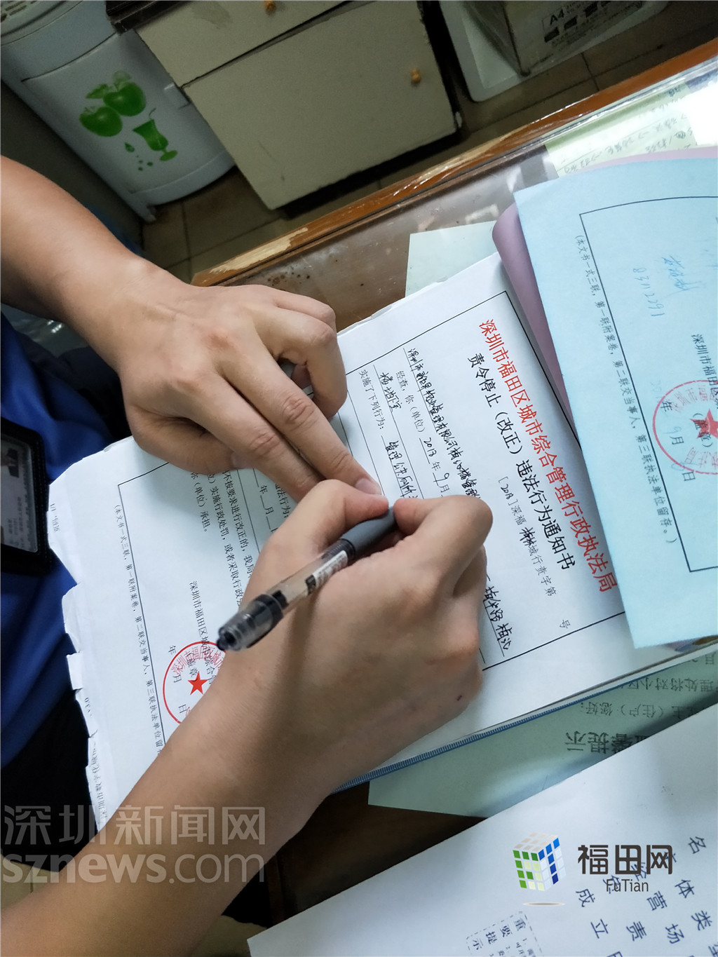 福田街道執(zhí)法隊給購物公園管理處開具責(zé)令停止(改正)違法行為通知書。