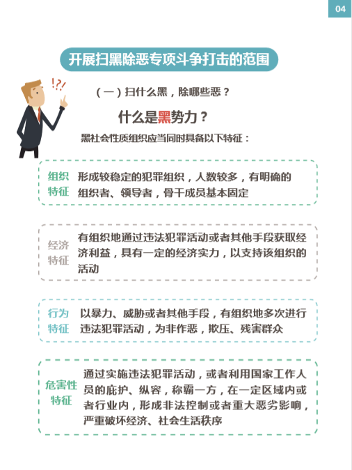 掃黑除惡普法“口袋書”是一本“普法書”,內(nèi)容共涉及11大類,分別是開展掃黑除惡專項(xiàng)斗爭(zhēng)的重大意義、總體要求、目標(biāo)任務(wù)、基本原則、打擊的范圍,以及掃黑除惡宣傳標(biāo)語(yǔ)、宣傳海報(bào),掃黑除惡進(jìn)行時(shí),深圳市掃黑除惡專項(xiàng)斗爭(zhēng)舉報(bào)獎(jiǎng)勵(lì)辦法,深圳市掃黑除惡辦關(guān)于市、區(qū)、各行業(yè)掃黑除惡專項(xiàng)斗爭(zhēng)舉報(bào)電話的公告,涉黑涉惡類犯罪相關(guān)罪名及法律條文。“口袋書”是一本“明白書”,以圖文相結(jié)合的方式,內(nèi)容提綱挈領(lǐng),語(yǔ)言精煉,通俗易懂,把掃黑除惡專項(xiàng)斗爭(zhēng)的有關(guān)法律、政策法規(guī)進(jìn)行準(zhǔn)確、細(xì)致的解讀,明明白白地交給市民?!翱诖鼤庇质且槐尽胺奖銜保媸皆O(shè)計(jì)活潑,書體輕便,可隨身攜帶,方便閱讀。