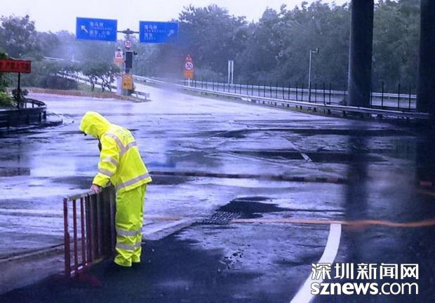 邊檢民警冒雨在強(qiáng)臺(tái)風(fēng)中固定好引導(dǎo)分流鐵馬