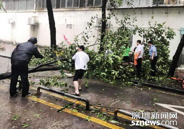 邊檢民警冒雨在執(zhí)勤現(xiàn)場(chǎng)搬挪被強(qiáng)臺(tái)風(fēng)刮倒的樹枝