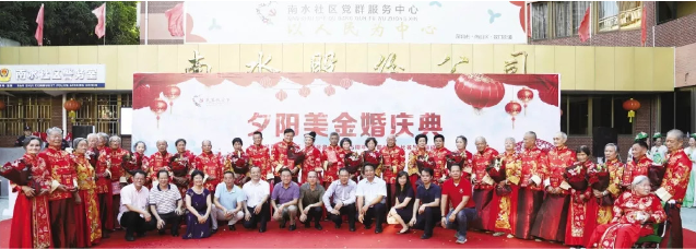 蛇口街道南水社區(qū)居民耿玉璽與王月鳳兩位老人已經(jīng)攜手走過(guò)69年,一直有個(gè)遺憾藏在心里——兩人年輕時(shí)沒(méi)有舉辦過(guò)婚禮,連一張結(jié)婚照片都沒(méi)有。日前,二老的遺憾得到彌補(bǔ),愿望得以實(shí)現(xiàn)。南水社區(qū)黨委以開展民生微實(shí)事為契機(jī),為包括耿玉璽與王月鳳夫婦在內(nèi)的社區(qū)15對(duì)老年夫婦舉辦了一場(chǎng)別開生面的夕陽(yáng)美集體金婚慶典活動(dòng)。眾多嘉賓及老人的親朋好友、子女兒孫到場(chǎng)見證,獻(xiàn)上掌聲和祝福。