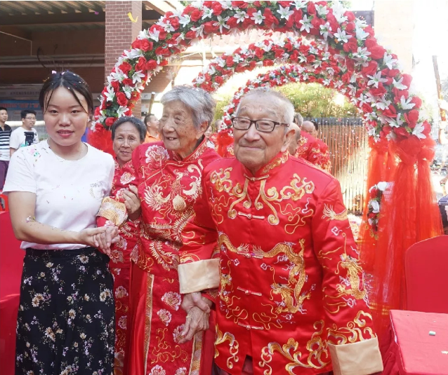 當(dāng)日下午,伴隨著婚禮進(jìn)行曲響起,金婚老年夫婦身穿中國傳統(tǒng)服飾,緩緩走上紅毯,通過拱形花門,步入慶典會(huì)場。他們微微顫抖的手緊緊握在一起,早已爬滿皺紋的臉上笑開了花?,F(xiàn)場頓時(shí)洋溢起幸福的味道和甜蜜的氣息。