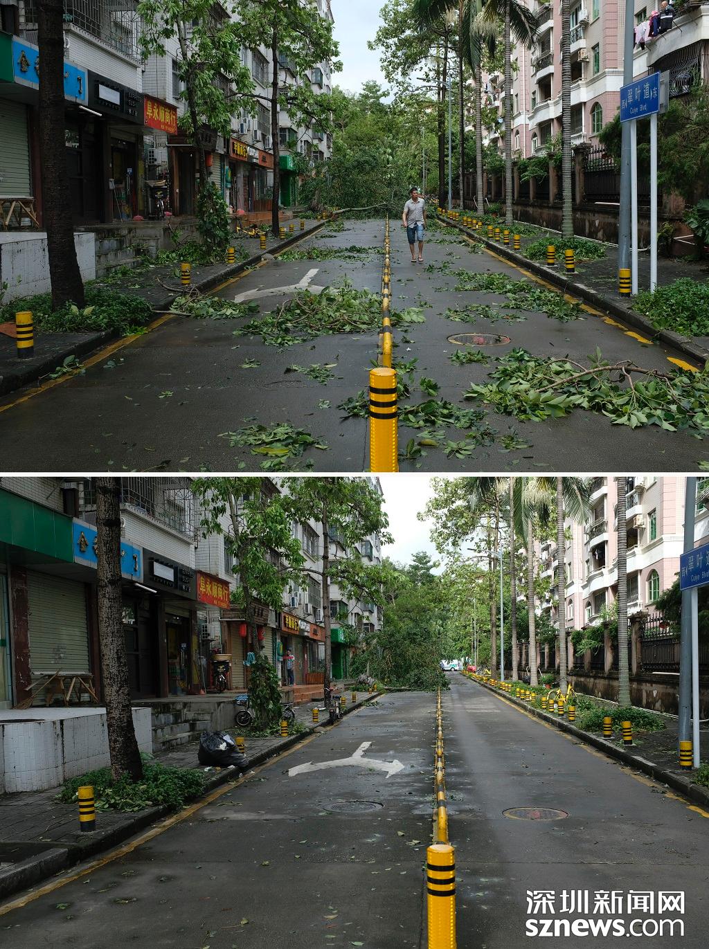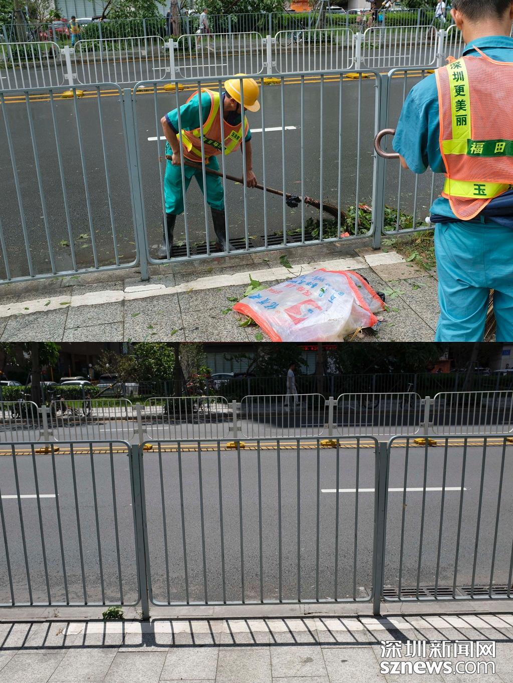 蓮花西地鐵站A出口前后對(duì)比圖(上圖:2018年9月17日,臺(tái)風(fēng)過(guò)后,路面一片狼藉,環(huán)衛(wèi)工人正在清掃。下圖 2018年9月18日下午五點(diǎn),路面清掃完畢,恢復(fù)整潔)