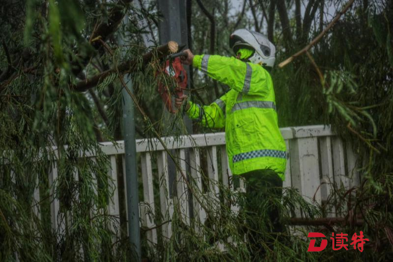 在9月18日新聞聯(lián)播中播放的臺(tái)風(fēng)現(xiàn)場(chǎng)畫面中,有一段正是艾力軍4人在羅沙路上清除路障過程中記錄的。當(dāng)時(shí),艾力軍正拿起手機(jī)為同事記錄,突然一陣狂風(fēng)猛掃過來,姚書龍、陳展聰尚能在風(fēng)中勉強(qiáng)站住,而陳展廷卻因站立不穩(wěn)被風(fēng)吹著跑了近10米才停下。所幸,陳展廷抓住路邊的護(hù)欄才沒被吹倒。這段視頻在最近兩天也在社交軟件中廣為流傳,3位“小黃人”中2人頂風(fēng)艱難站立,1人被風(fēng)吹跑,看似“滑稽”的畫面中仔細(xì)品味,超強(qiáng)臺(tái)風(fēng)中堅(jiān)守崗位的艱辛在視頻中盡顯無疑。