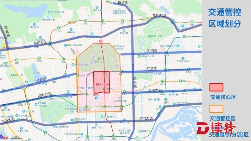 (一)交通核心區(qū):紅荔路以南、深南大道(金田至益田段)北側(cè)輔道(不含)以北,金田路(紅荔至深南段)以西、益田路(紅荔至深南段)以東的合圍區(qū)域。