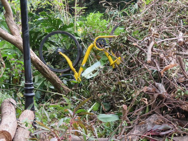 與廢棄樹(shù)枝堆成一團(tuán)的共享單車 深圳論壇網(wǎng)友“noelam”攝