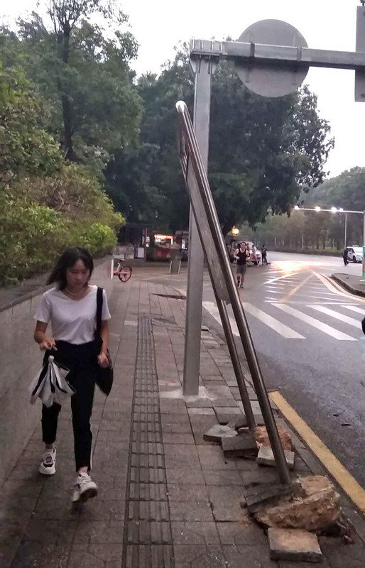 存在安全隱患的不僅電線桿,記者在蓮花山公園附近一人流量較大的十字街頭發(fā)現(xiàn),有一塊交通路牌也被“山竹”吹的東倒西歪,其底部根基已經(jīng)翻出一半,讓人擔(dān)心其會(huì)隨時(shí)倒下、危及過(guò)往路人安全?!拔颐刻焐舷掳喽紩?huì)經(jīng)過(guò)這里,騎著車又不得不走路牌內(nèi)側(cè),每次都有點(diǎn)小怕,擔(dān)心牌子會(huì)突然倒下砸到我。”附近的居民向記者吐槽道。