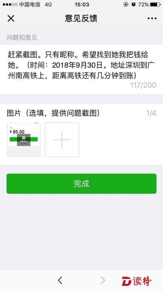深圳新聞網(wǎng)訊 深圳市民李先生高鐵上補票,因為沒帶現(xiàn)金,向一位女乘客借了85元現(xiàn)金,他用微信向女乘客轉賬時,由于高鐵上手機網(wǎng)絡不好,還沒等轉賬成功,女乘客就匆匆下車了。這件事讓李先生耿耿于懷,希望市民網(wǎng)友幫忙尋找這位好心女乘客,讓他能把85元還給她。
