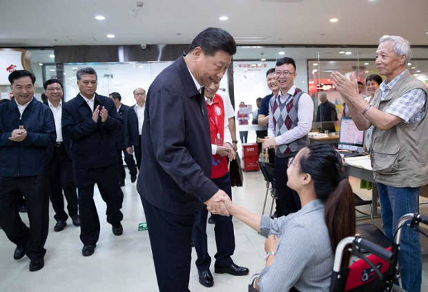 24日上午,社區(qū)居民張瑩瑩正在社區(qū)圖書館查閱資料,習(xí)近平總書記向她走來,與她親切交流。張瑩瑩5歲的時(shí)候因?yàn)樾郝楸园Y落下了腿疾,行動(dòng)不便。她告訴總書記,社區(qū)有300多名殘疾人士,這里有專門為殘疾居民設(shè)計(jì)的戶型。