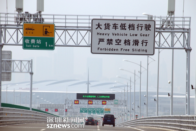 距離珠海收費站還有1公里,這里是一段下坡,指示牌提醒嚴(yán)禁空檔滑行