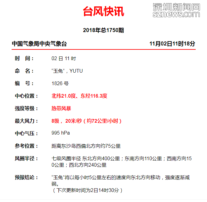 記者從深圳市氣象臺獲悉,臺風(fēng)“玉兔”(強熱帶風(fēng)暴級),1日14時距離深圳約372公里,中心附近最大風(fēng)力11級(30米/秒),預(yù)計“玉兔”將以每小時7公里左右的速度向偏北方向移動,2日上午距離深圳市最近約300公里,強度明顯減弱,較大可能于2-3日在南海東北部減弱消失。