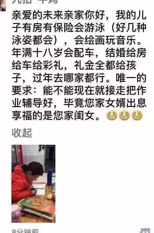 這兩天刷爆朋友圈的一種特殊的文體在朋友圈火了起來,這些文章都是寫給未來的親家的,文章開頭先是對自家娃大力夸獎一番,什么有房有車、會游泳、婚禮豪配等要素,一個都不落下;文章的最后提出唯一的要求,那就是把娃現(xiàn)在就接走。這些文章充分顯示了家長在輔導自己孩子做作業(yè)的時候,心情不太舒暢。