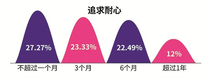 在追求耐心方面,有超七成單身男女追求愛情的時(shí)間不超過半年,其中27.27%的單身表示對喜歡的人追求時(shí)間不超過一個(gè)月,23.33%的人追求時(shí)間為3個(gè)月,另外有22.49%愿意追求時(shí)間為6個(gè)月,僅有12%的單身男女追求喜歡的人愿意超過1年。