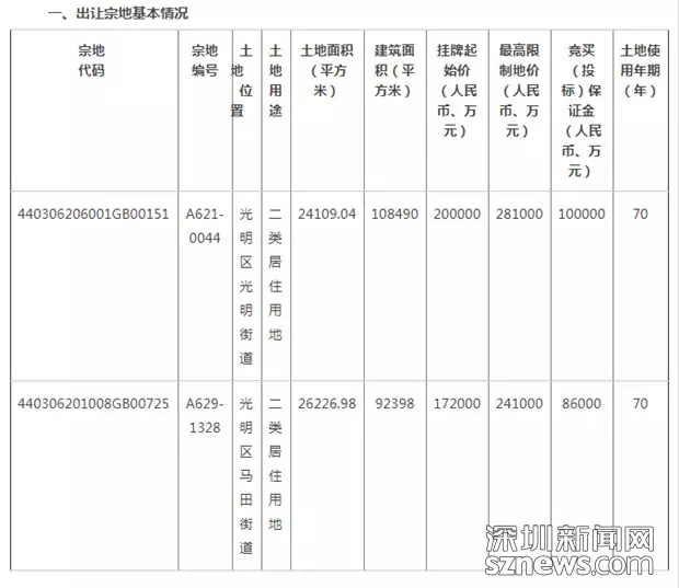 本次出讓的兩宗地分別是位于光明區(qū)光明街道的A621-0044宗地和位于光明區(qū)馬田街道的A629-1328宗地。前者土地面積24109.04平方米,建筑面積108490平方米,掛牌起始價20億元;后者土地面積26226.98平方米,建筑面積92398平方米,掛牌起始價17.2億元。土地使用權(quán)均為70年。其中,A621-0044宗地人才住房初始配建面積為9800平方米,A629-1328宗地人才住房初始配建面積為8100平方米。