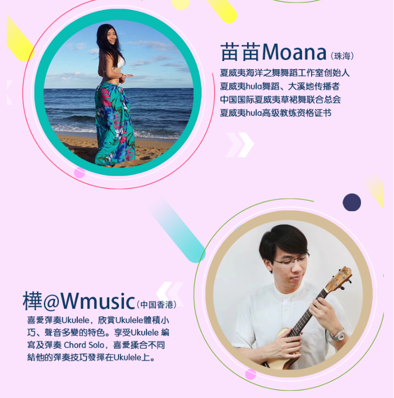 其中全民參與嘉年華音樂會11月17日的將會在深圳市玫瑰海岸沙灘舉辦,有深圳、香港(中國)、臺灣(中國)、美國、日本、廣州、中山、珠海等地的嘉賓和愛好者近50組表演者帶來4小時尤克里里盛會,表演者年齡跨度更是從5歲到60歲。嘉年華現(xiàn)場除了尤克里里音樂會,還將有Moana夏威夷呼拉舞風(fēng)情體驗,中國臺灣尤克里里協(xié)會會長陳建廷新書《兒童尤克里里英文暢游》深圳首發(fā),中國臺灣尤克里里世界大賽冠軍蔡皓怡原創(chuàng)專輯《航海日志》深圳首發(fā),以及美國尤克里里音樂家、藝術(shù)家新專輯《粉色海豚》尤克里里專輯中國大陸首發(fā)。