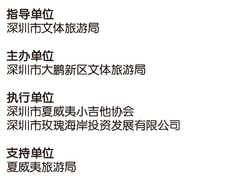 大鵬新區(qū)擁有相對豐富的尤克里里音樂文化底蘊,新區(qū)音樂學(xué)科自2015年已經(jīng)與深圳市夏威夷小吉他協(xié)會開展合作,為全區(qū)音樂教師開展尤克里里師資培訓(xùn)至今,在全國中小學(xué)音樂教師體系率先開展尤克里里課程。本屆大鵬的嘉年華將會為大鵬的學(xué)校,社區(qū)帶來更多的資源,與更多國際尤克里里協(xié)會,知名演奏家交流與互動,讓這種浪漫自由的樂器能在新區(qū)扎根發(fā)芽,開花結(jié)果,將新區(qū)打造成中國的“尤克里里之鄉(xiāng)”。