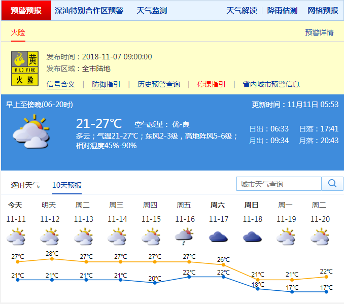 預計早晨7-9時,全市多云間陰天;氣溫21 ℃ -23 ℃,相對濕度75%-90%,輕微偏東風,能見度3-15公里。深圳市氣象臺2018年11月11日06:01發(fā)布。