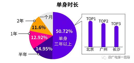 針對單身時長的調查發(fā)現(xiàn),有高達50.72%的人為單身三年以上的“長單族”,“長單族”占比最多的城市前三為北京、廣州和長沙。