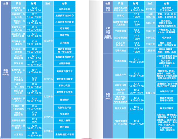 2018深圳公園文化季將延續(xù)往屆經(jīng)典品牌節(jié)目,滿足不同受眾的多元需求,推出兒童音樂(lè)劇、世界極限運(yùn)動(dòng)表演、燃動(dòng)鵬城2018福田文創(chuàng)音樂(lè)周、全國(guó)航空模型公開賽、戲曲專場(chǎng)等活動(dòng)。同時(shí)結(jié)合各公園特點(diǎn),打造中心公園風(fēng)箏表演、翠竹公園首屆竹文化音樂(lè)會(huì)、皇崗公園非遺主題展、梅林公園社區(qū)展演、筆架山公園“深港穗”草地滾球賽等公園特色文化活動(dòng)。