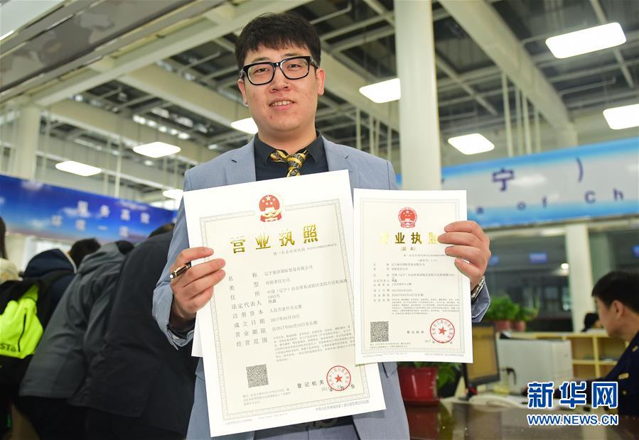 在沈陽片區(qū)政務(wù)服務(wù)中心,一位企業(yè)代表注冊當(dāng)天拿到了營業(yè)執(zhí)照(2017年4月10日攝)。新華社記者 楊青攝