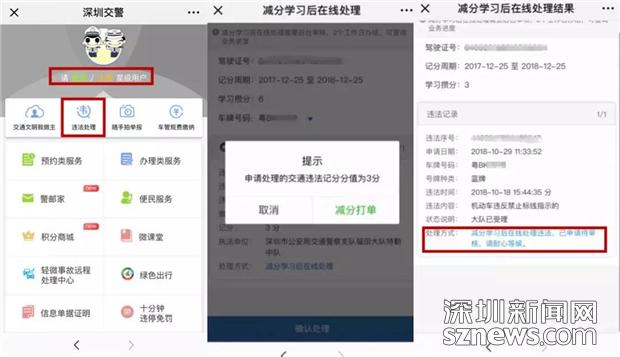獲得記分后,可打開深圳交警星級(jí)用戶入口(微信公眾號(hào)、支付寶城市服務(wù)、深圳交警APP),點(diǎn)擊“違法處理-使用減分學(xué)習(xí)獲得記分處理交通違法”申請辦理,2個(gè)工作日內(nèi)完成審核,申請人可在線繳款,處理完畢。值得注意的是,減分學(xué)習(xí)獲得的記分只能處理深圳車在深圳范圍內(nèi)的交通監(jiān)控設(shè)備的交通違法,并且單次處理的交通違法記分不得超過3分,一次記分周期內(nèi)使用此部分記分處理不得超過6分。