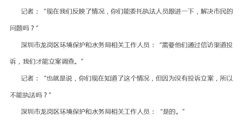以下是記者與深圳市龍崗區(qū)環(huán)境保護和水務(wù)局信訪部門工作人員的部分對話: