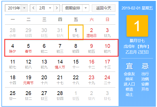 2019年春節(jié)是2月5日(星期二),根據(jù)規(guī)定春節(jié)法定放假時間是初一到初六,調休7天。2019年2月2日、2月3日需上班調休。