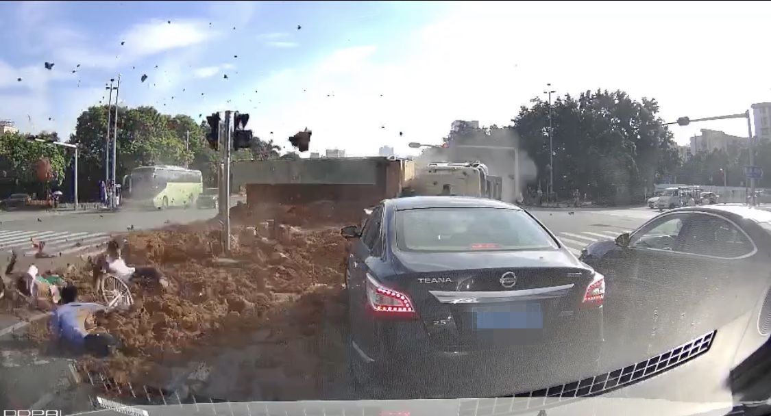 9月12日早上8點(diǎn)14分許,謝某勇駕駛粵BEE930號重型自卸貨車在寶安區(qū)新安街道新安一路由東往西行駛至翻身路口時,遇同方向右側(cè)陳某強(qiáng)駕駛的粵PC8922號摩托車斜插進(jìn)入路口,謝某勇立即采取緊急制動并向左側(cè)打方向避讓,導(dǎo)致車輛側(cè)翻與陳某強(qiáng)發(fā)生碰壓后,車上的泥土瞬間傾瀉而出,沖擊在該路口西側(cè)路中安全島等候通行的5個人(4人皮外傷),致兩臺車不同程度損壞,陳某強(qiáng)當(dāng)場死亡。