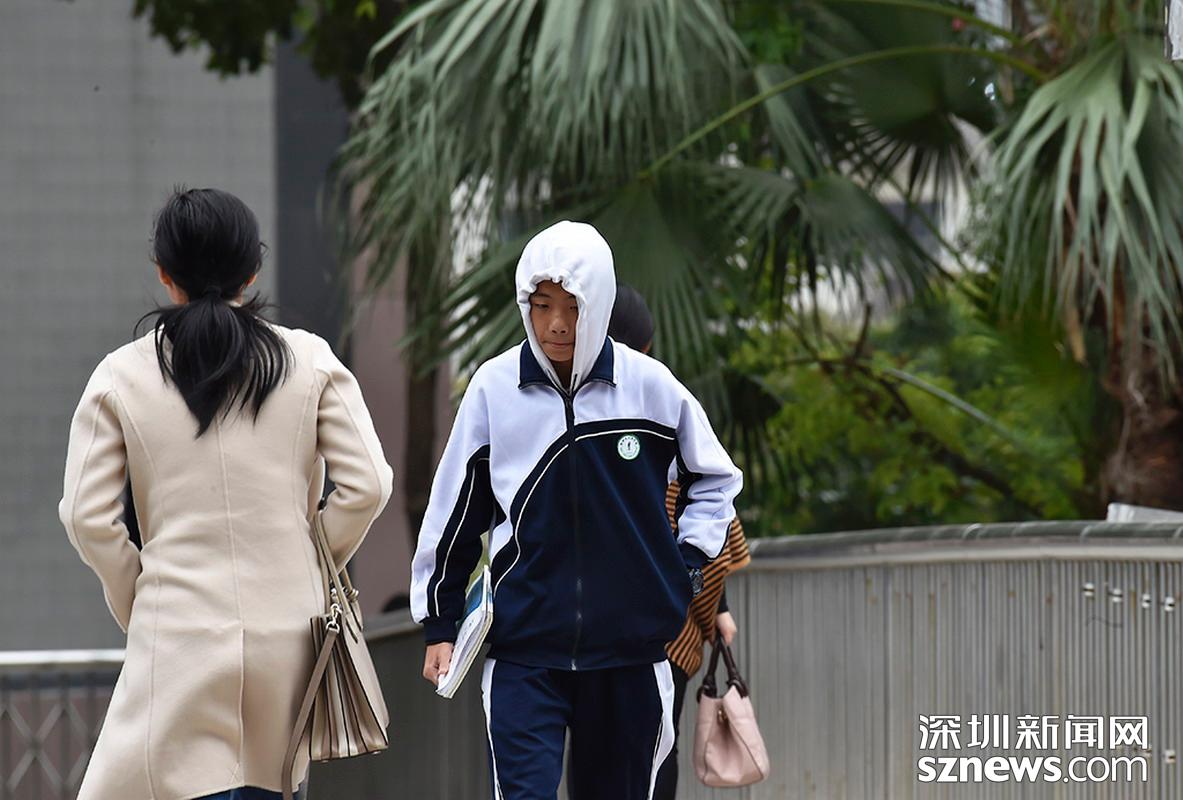2018年12月12日,羅湖翠竹天橋,穿著校服的少年帶上帽子御寒。
