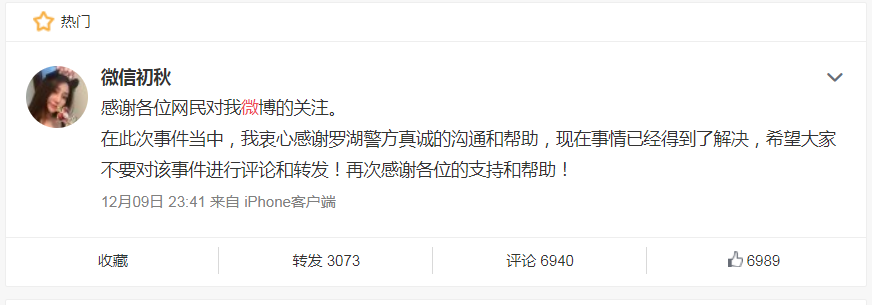 9日晚,網友“微信初秋”再次發(fā)文表示:事情已經得到解決,感謝網友關注