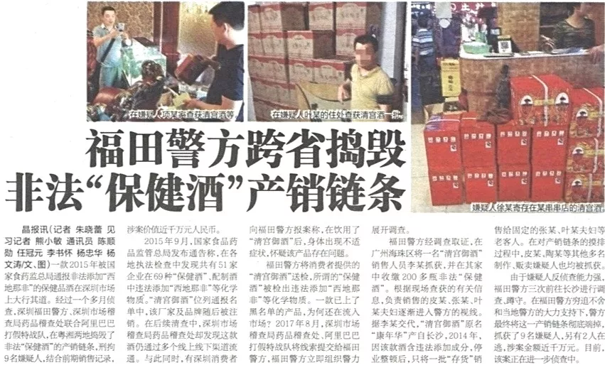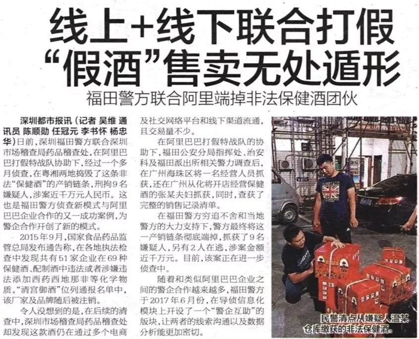 ★★福田警方聯(lián)合深圳市場稽查局藥品稽查處,在阿里巴巴“打假特戰(zhàn)隊(duì)”協(xié)助下,經(jīng)過一個多月偵查,于粵湘兩地?fù)v毀了非法“保健酒”的產(chǎn)銷鏈條,刑拘9名嫌疑人,涉案價(jià)值近千萬元人民幣。