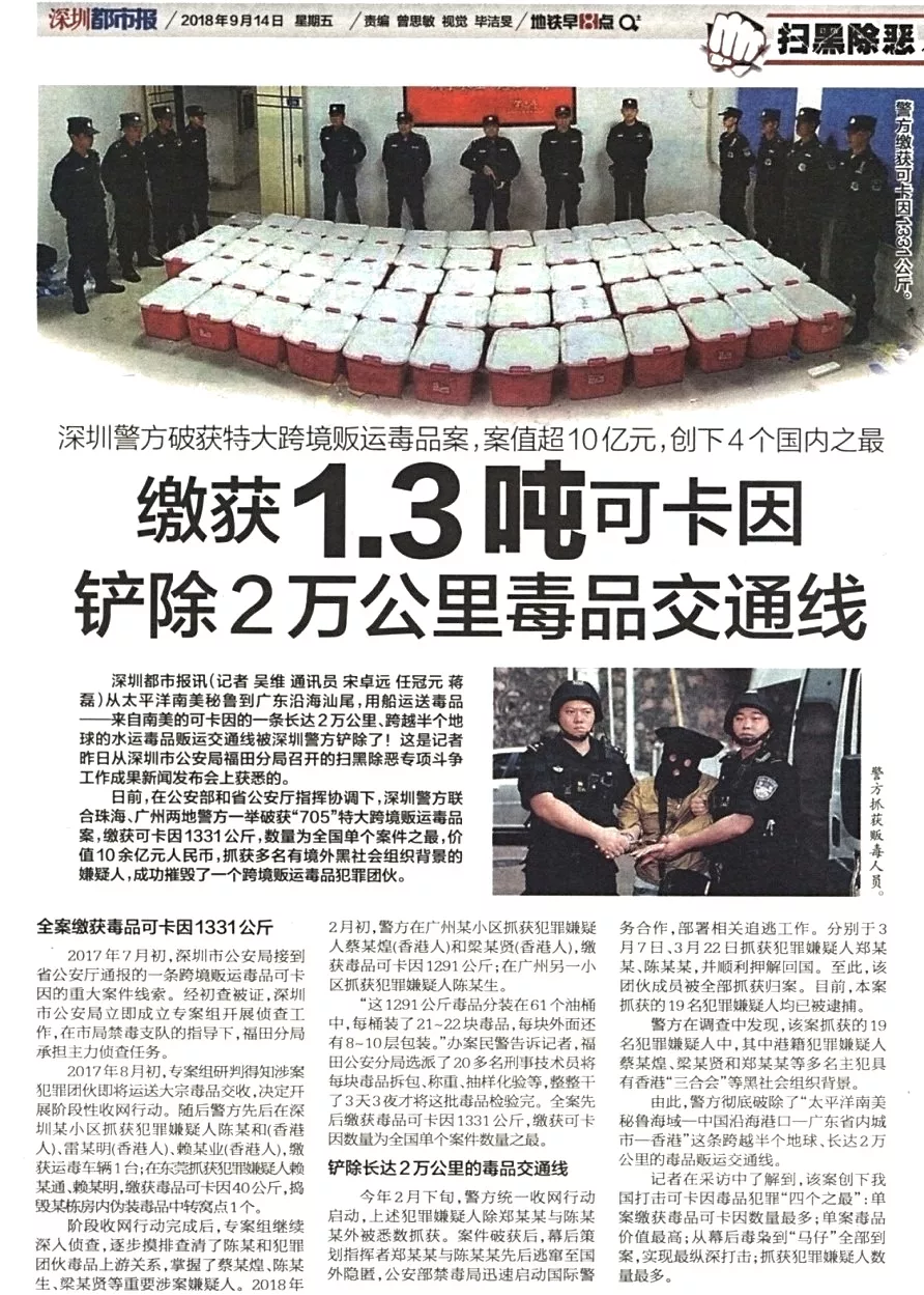 ★★在公安部和省公安廳指揮協(xié)調(diào)下,福田警方作為主力軍,聯(lián)合珠海、廣州兩地警方一舉破獲“705”特大跨境販運(yùn)毒品案,創(chuàng)下我國打擊可卡因毒品犯罪“四個之最”:單案繳獲毒品可卡因數(shù)量最多;單案毒品價(jià)值最高;從幕后毒梟到“馬仔”全部到案,實(shí)現(xiàn)最縱深打擊;抓獲犯罪嫌疑人數(shù)量最多。