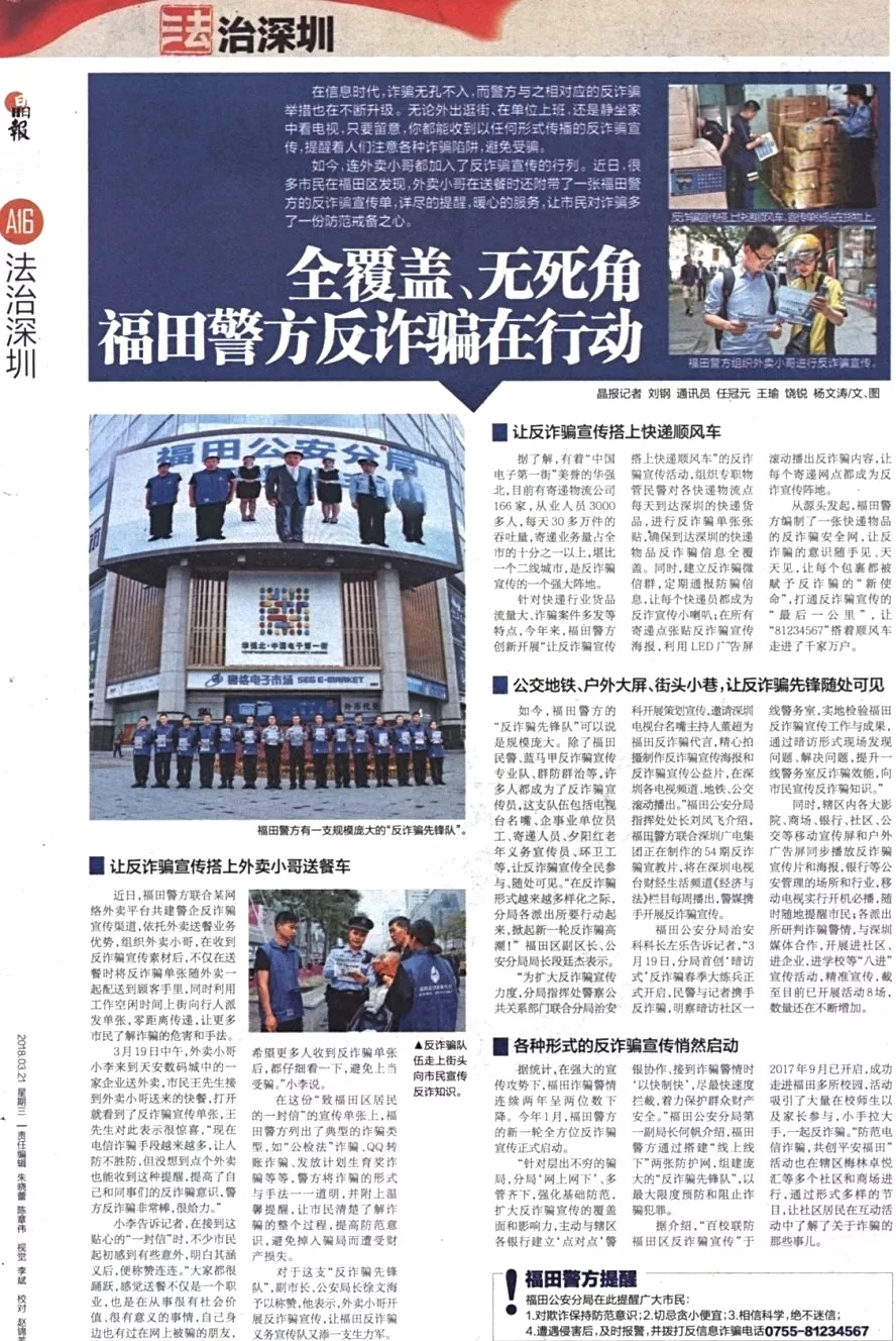★★福田警方通過搭建“線上線下”兩張防護(hù)網(wǎng),組建龐大的“反詐騙先鋒隊(duì)”,多管齊下,擴(kuò)大反詐騙宣傳的覆蓋面和影響力,最大限度預(yù)防和阻止詐騙犯罪。