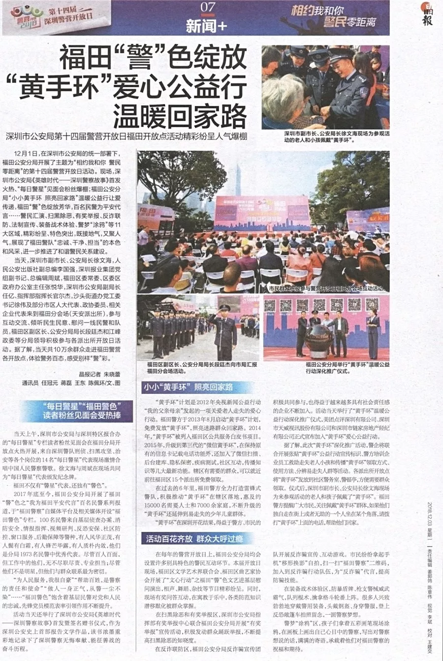 ★★12月1日,在深圳市公安局的統(tǒng)一部署下,福田公安分局開展了主題為“相約我和你警民零距離”的第十四屆警營開放日活動。現(xiàn)場,深圳市公安局《英雄時代——深圳警察故事》首發(fā)火熱、“每日警星”見面會粉絲爆棚;福田公安分局“小小黃手環(huán)照亮回家路”溫暖公益行讓愛傳遞,福田“警”色綻放芳華、百名民警為平安代言……警民匯演、掃黑除惡、有獎舉報(bào)、反詐聯(lián)防、法制宣傳、裝備戰(zhàn)術(shù)體驗(yàn)、警夢涂鴉等11大區(qū)域,精彩紛呈、特色突出,進(jìn)一步推進(jìn)了和諧警民關(guān)系建設(shè)。