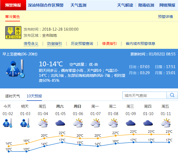 深圳新聞網(wǎng)2019年1月2日訊(記者 陳婕)記者從深圳市氣象局了解到,2日有分散小雨;9-13℃;北風(fēng)3級,東部沿海和高地陣風(fēng)6-7級;濕度60%-85%。預(yù)計(jì)3日持續(xù)陰冷;4-5日陰天間多云,偶有零星小雨,最低氣溫明顯回升;6日起多云到晴天,氣溫小幅波動。
