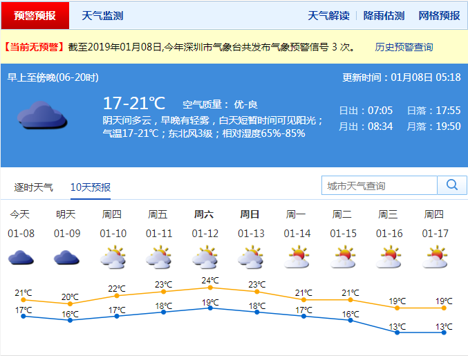 深圳市氣象局預(yù)計(jì),8日陰天間多云,早晚有輕霧,短暫時(shí)間可見(jiàn)陽(yáng)光;氣溫15-20℃;東北風(fēng)3級(jí);相對(duì)濕度65%-85% 。9-10日陰天間多云,偶有零星小雨,短暫時(shí)間可見(jiàn)陽(yáng)光;11-14日多云間陰天,可見(jiàn)陽(yáng)光,天氣溫暖,早晚能見(jiàn)度較差。