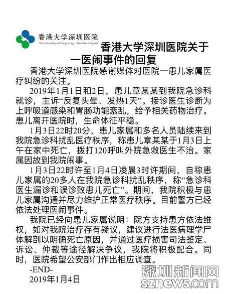 1月16日,香港大學(xué)深圳醫(yī)院就患兒章某某就診后家中猝死事件成立獨(dú)立調(diào)查組,待調(diào)查完畢后將把相關(guān)結(jié)果提交主管部門并對(duì)外公布。