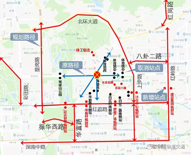 1.臨時(shí)取消站點(diǎn)15個(gè):全封閉施工期間,取消體育館、筆架山公園、海馨苑、體育館西、百花一路等5對(duì)車站,及華新路北側(cè)站、百花二路南側(cè)站、百花村南側(cè)站等,共計(jì)15個(gè)站點(diǎn)(含分站),增設(shè)14個(gè)臨時(shí)停靠點(diǎn)(花卉世界臨時(shí)站、華新村臨時(shí)站、群星廣場(chǎng)臨時(shí)站、計(jì)生中心臨時(shí)站、建設(shè)集團(tuán)臨時(shí)站、體工宿舍、華富北屋村、長(zhǎng)樂花園、百花三路)。(詳見圖3)