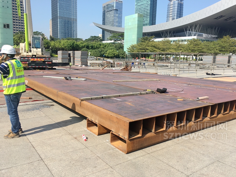 在市民中心南廣場搭建春晚深圳分會(huì)場舞臺(tái),借助深圳燈光秀為背景,確實(shí)是一個(gè)絕佳的創(chuàng)意。要實(shí)現(xiàn)創(chuàng)意,搭建舞臺(tái)是關(guān)鍵一役。去過南廣場看燈光秀的深圳人應(yīng)該知道,南廣場中間位置正好是地下車庫的玻璃采光棚,春晚主舞臺(tái)剛好就位于廣場玻璃采光棚的正上方。玻璃材質(zhì)決定了它無法承受上部集中荷載,需要事先改變傳力路徑或?qū)龅叵虏苛喊暹M(jìn)行加固處理,謝衛(wèi)兵和同事發(fā)現(xiàn),研究舞臺(tái)局部可操作性的加固方案迫在眉睫。