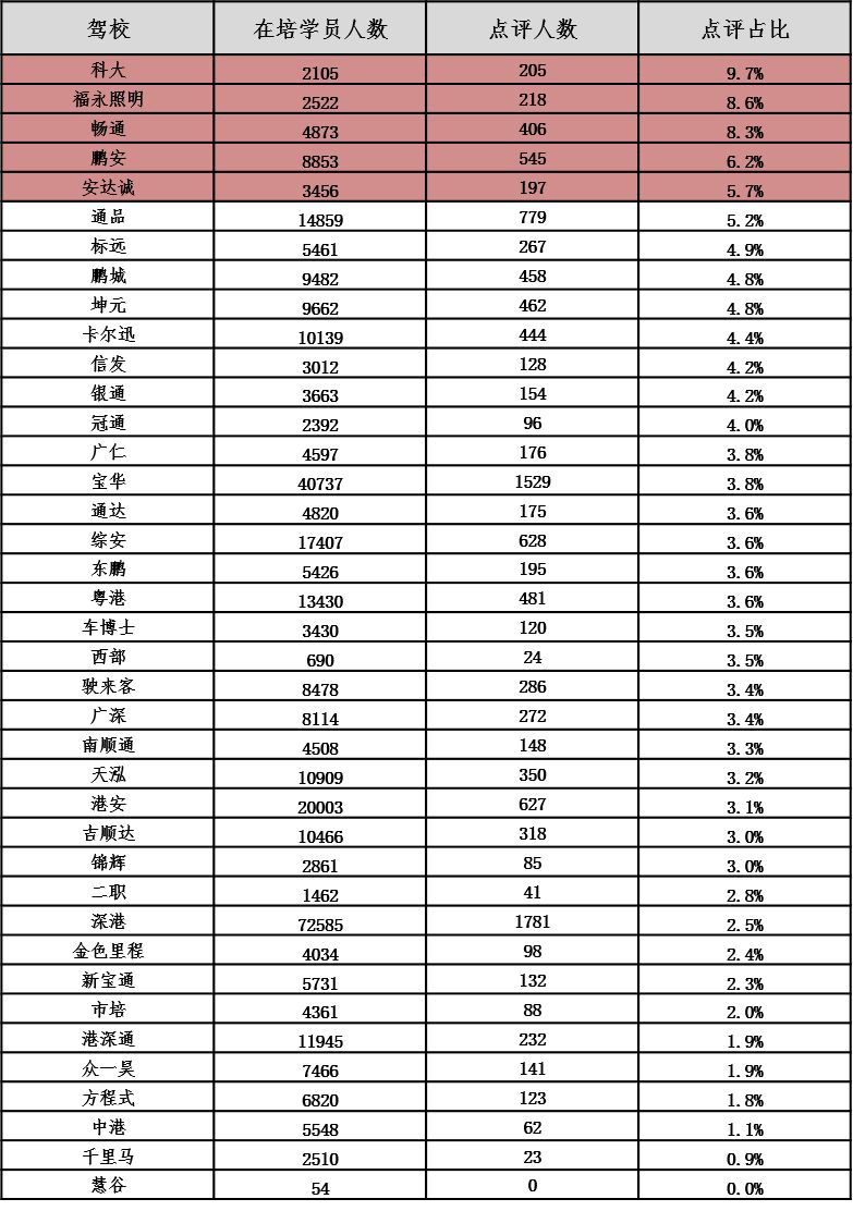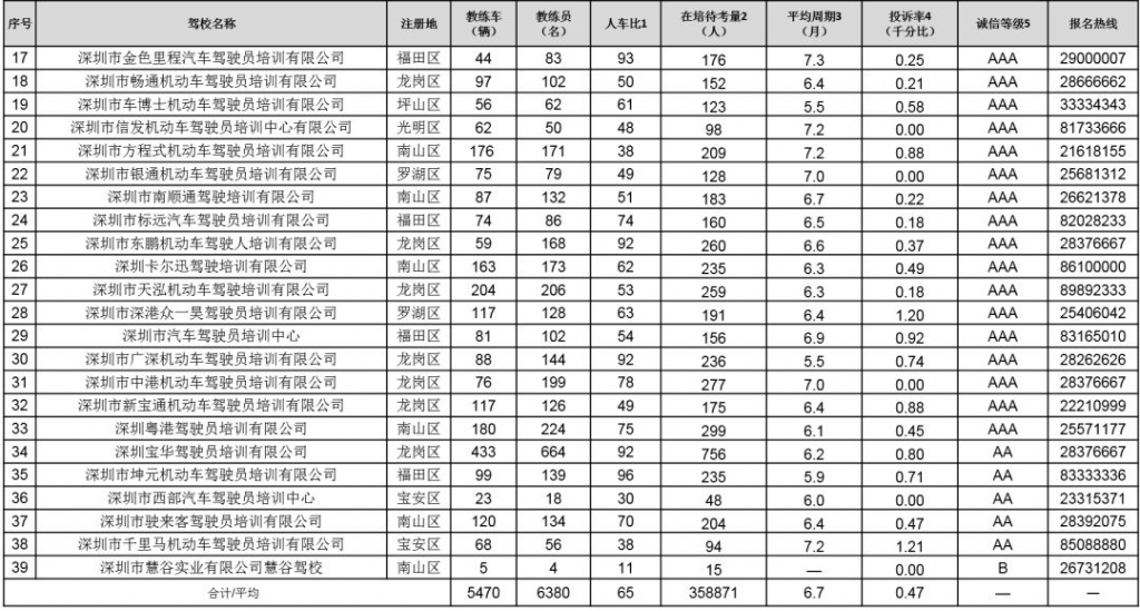 以下對(duì)深圳各駕校詳細(xì)信息進(jìn)行公布,市民可根據(jù)下表,選擇人車比和在培待考量相對(duì)較低、學(xué)車周期較短、投訴率較低、誠(chéng)信評(píng)價(jià)等級(jí)較高的駕校進(jìn)行培訓(xùn):